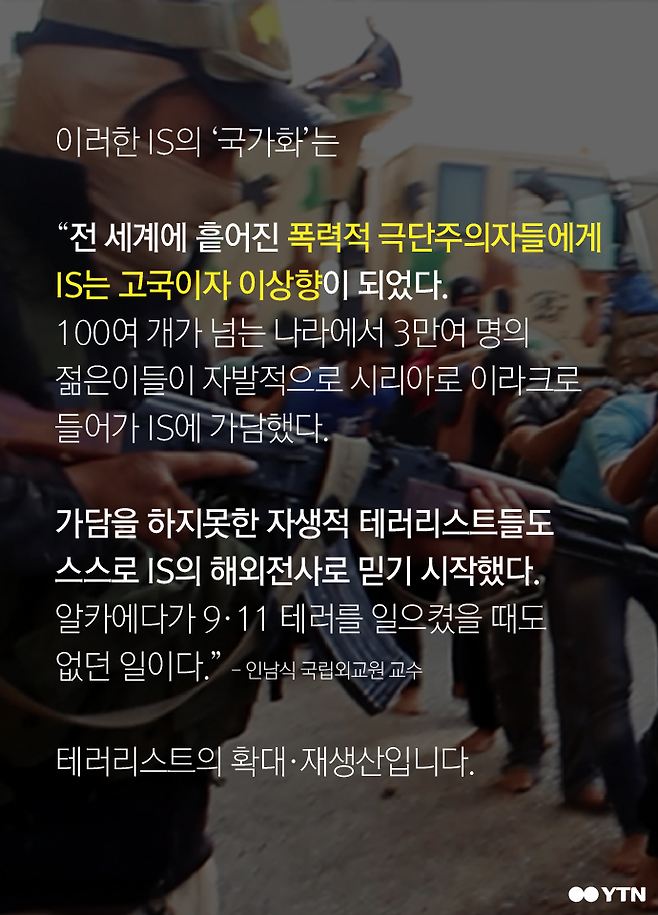 "전 세계에 흩어진 폭력적 극단주의자들에게 IS는 고국이자 이상향이 되었다. 100여 개가 넘는 나라에서 3만여 명의 젊은이들이 자발적으로 시리아로 이라크로 들어가 IS에 가담했다.
