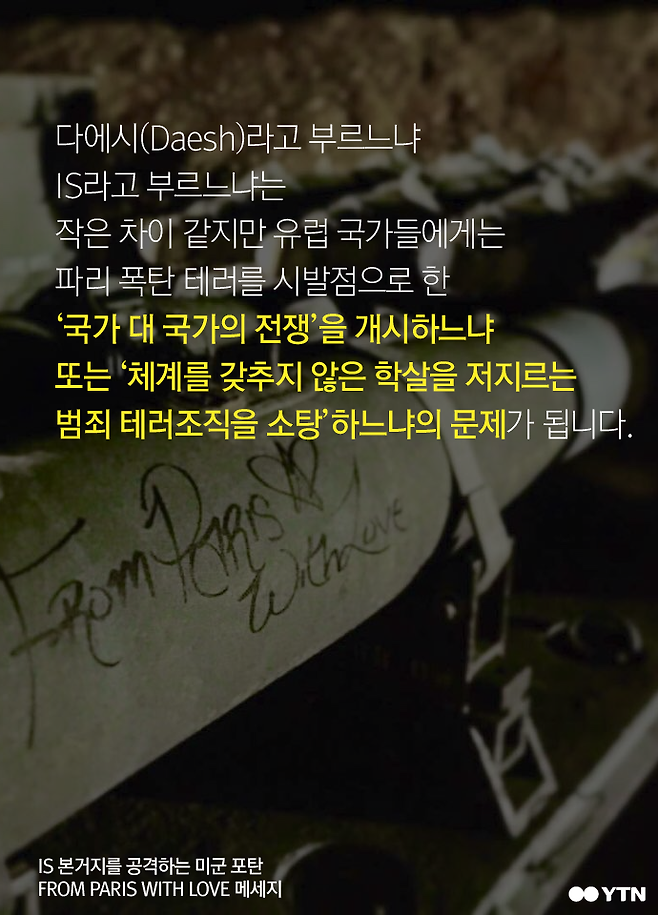 파리 폭탄 테러를 시발점으로 한 '국가 대 국가의 전쟁'을 개시하느냐 또는 '체계를 갖추지 않은 학살을 저지르는 범죄 테러조직을 소탕'하느냐의 문제가 됩니다.
