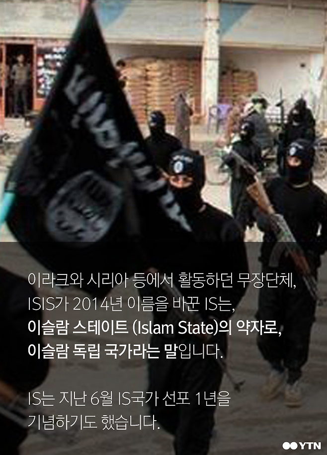 이라크와 시리아 등에서 활동하던 무장단체, ISIS가 2014년 이름을 바꾼 IS는, 이슬람 스테이트 (Islam State)의 약자로, 이슬람 독립 국가라는 말입니다.