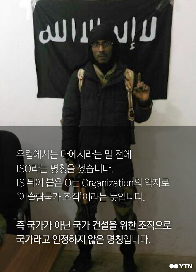 유럽에서는 다에시라는 말 전에 ISO라는 명칭을 썼습니다. IS 뒤에 붙은 O는 Organization의 약자로 '이슬람국가 조직'이라는 뜻입니다.
