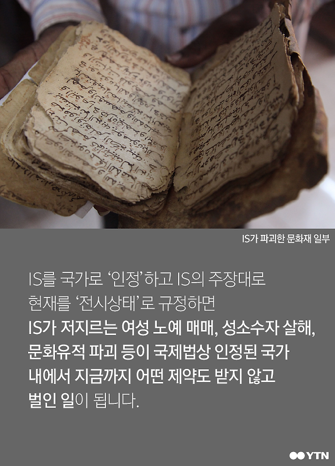 IS를 국가로 '인정'하고 IS의 주장대로 현재를 '전시상태'로 규정하면 IS가 저지르는 여성 노예 매매, 성수수자 살해, 문화유적 파괴 등이 국제법상 인정된 국가 내에서 지금까지 어떤 제약도 받지 않고 벌인 일이 됩니다.