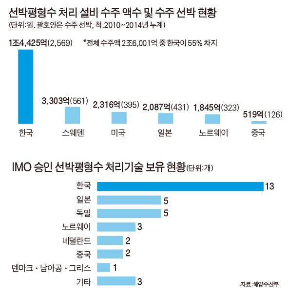 반면 한국은 2007년 선박평형수 관리법을 제정하는 등 일찍부터 차근차근 준비를 해왔다. 2003년부터 국내 기업을 지원, 평형수 처리 기술 개발에도 앞장서 왔다. 협약이 발효되면 IMO가 승인한 기술을 이용한 설비만이 허용되는데, 승인된 37개의 설비 기술 중 13개(35%)를 한국 기업이 보유하고 있다. 테크로스, 삼성중공업, 현대중공업 등 2010~2014년 누적 설비 수주액은 1조4,425억원으로, 전 세계 수주액(2조6,001억)의 55%에 달한다. 압도적인 점유율이다.