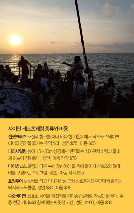 가족여행이나 아이를 동반한 방문의 경우 선뜻 ‘모험’ 성격이 포함된 바다 스포츠를 즐기러 나가기가 어렵다. 사이판 월드리조트는 자연의 해변을 생생하게 느낄 수 있는 파도풀, 물벼락을 시원하게 맞을 수 있는 아쿠아 어드벤처, 튜브에 몸을 싣고 편안히 흘러다니는 아마존리버, 220m 길이의 슬라이드 ‘마스터 블라스터’ 등 신나는 물놀이 기구들이 잔뜩 있는 워터파크다. 전용비치에서는 스노클링, 카약, 윈드서핑 등 맛보기 해양스포츠도 체험할 수 있다. 투숙객에게는 여러가지 혜택이 주어지니 먹고 자고 놀고를 이곳에서 모두 해결하는 것도 좋을 듯.