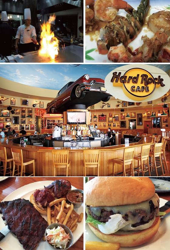 하드락카페는 ‘베스트 선샤인 라이브’ 카지노와 연결된 곳에 있다. 세계 공통의 상징인 일렉트릭 기타가 걸려있고 넓고 높은 홀에는 캐딜락 클래식 세단이 매달려 있다. 흥겨운 로큰롤 뮤직과 빈티지 느낌의 뮤직박스, 스타들의 기념품 등이 여행자의 영혼을 채워준다. 한 먹성 하는 사람이라면 미국인 덩치에 기준을 맞춘 스테이크, 햄버거에 침을 흘리지 않을 수 없다. 영어가 가능하면 모를까, 서툰 사람이라면 메뉴 선택은 한글과 사진이 포함된 메뉴판 도움을 받을 수 있다. 단, 고기 익히는 정도, 사이즈, 함께 마실 음료 등을 모두 선택한 후 주문에 들어가는 게 좋다. 홀 직원들은 한글을 전혀 알아듣지 못하기 때문이다. 스테이크 가격은 20~30달러 중반 정도이고 햄버거는 10~20달러 수준이다. 샐러드, 샌드위치 등 미국식 레스토랑에서 파는 대부분의 메뉴를 맛볼 수 있다. 1층 하드락카페 숍에서는 하드락카페 티셔츠, 재킷 등 패션 상품과 소품을 쇼핑할 수 있다.