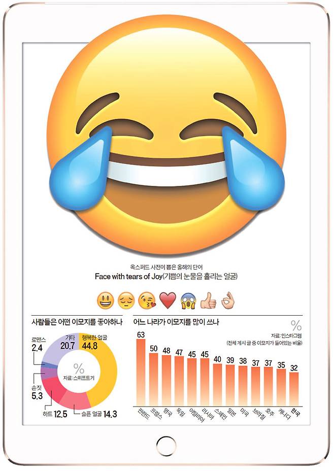 한낱 이모지를 거창하게 봤을 수도 있다. 그런데 영국의 옥스퍼드대학이 발간하는 옥스퍼드사전은 사상 처음 글자가 아닌 그림을 ‘2015 올해의 단어’로 뽑았다. ‘기쁨의 눈물을 흘리는 얼굴(face with tears of joy)’ 이모지다. 옥스퍼드사전 측은 “이모지는 더 이상 10대의 전유물이 아니라 언어의 장벽을 뛰어넘는 수단”이라고 설명했다.
