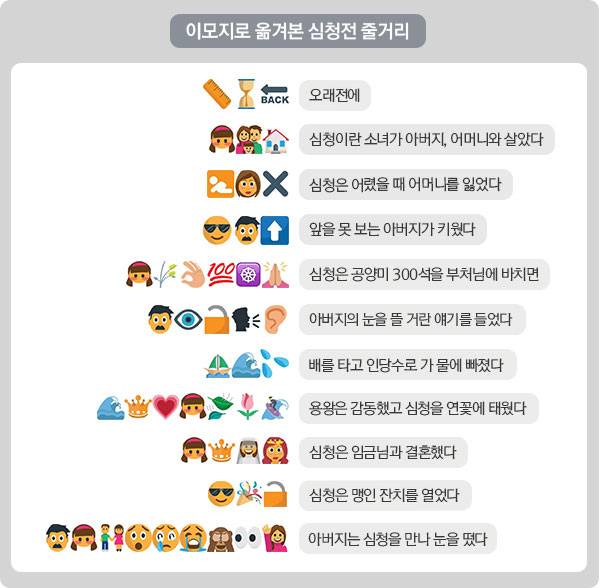 그래서 고전 『심청전』의 줄거리를 기자가 이모지로 옮겨 봤다. 독자의 이해를 돕기 위해 주요 구절마다 해석을 붙였다.