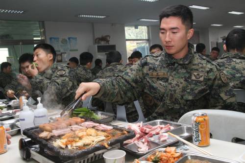 ‘삼겹살 데이’를 급식에 반영해 월 1회 표준식단에 반영중이다. 제공되는 삼겹살은 100g을 기준으로 하지만, ‘음식물 쓰레기 줄이기’를 달성한 부대 등은 최대 300g까지 급식이 가능하다.