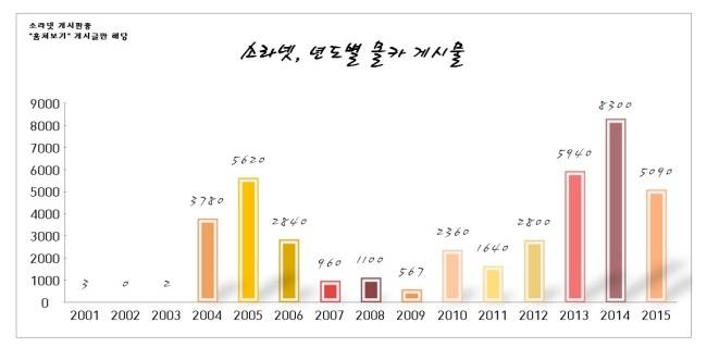 30일 ‘소라넷 고발프로젝트(가칭ㆍ이하 프로젝트팀)’로부터 단독 입수한 자료에 따르면 지난 2001년부터 올해까지 소라넷 게시된 총 몰카 게시물은 약 4만1400건에 달하는 것으로 집계됐다.