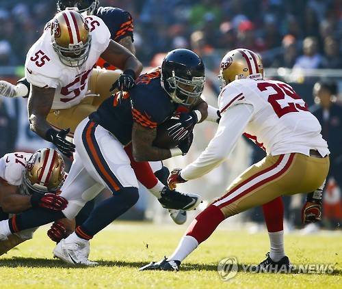 epa05057388 Chicago Bears running back Matt Forte (C) runs for a seven yard gain between San Francisco 49ers strong safety Jaquiski Tartt (R) and San Francisco 49ers outside linebacker Ahmad Brooks (L) in the first half of the NFL American football game between the San Francisco 49ers and the Chicago Bears at Soldier Field in Chicago, Illinois, USA, 06 December 2015. EPA/TANNEN MAURY
