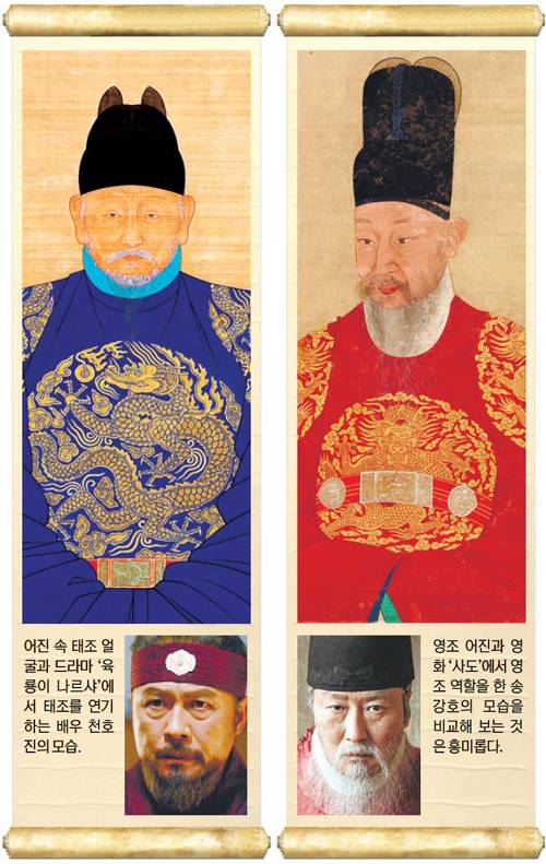 임금을 연기한 배우들은 빼어나게 잘생겼거나, 지금의 사람들이 선호하는 이미지를 갖고 있다. 실제 임금의 모습을 어땠을까. 태조와 영조는 “털끝 하나라도 틀리면 그 사람이 아니다”라는 초상화 제작의 원칙이 가장 충실하게 반영된 어진이 있다. 정조의 경우에는 표준영정이 있긴 하지만 현대적 상상의 산물이어서 실제 모습이라고 할 수 없다. 그러나 어진이든 표준영정이든 임금의 얼굴에는 그들이 살아간 시대, 이상적인 지도자의 모습이 담기기 마련이다.
