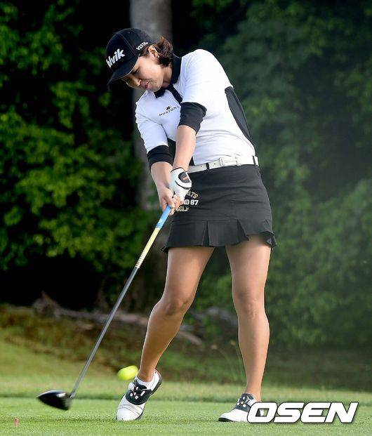 송민지 프로가 힘찬 드라이버 티샷을 날리고 있다.