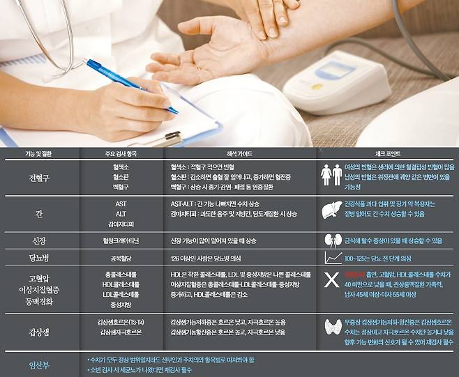 전혈구 검사 결과를 보자. 혈색소·혈소판·백혈구 등이 여기에 해당한다. 공단 검진에서는 혈색소검사를 가장 기본으로 한다. 혈색소는 혈액 속에 적혈구가 차지하는 비율을 나타낸다. 낮으면 빈혈, 높으면 다혈증(적혈구 증가증)을 의심한다. 수치가 정상 범위에 있더라도 위절제술을 받은 사람이라면 얘기가 달라진다. 위암이나 위궤양에 따른 천공으로 절제술을 받은 사람은 위산 분비가 줄고 철분·비타민B12 흡수가 잘 안 된다. 강북삼성병원 종합건진센터 이선진(가정의학과) 교수는 “정상 범위에 있지만 하한치에 걸려 있다면 빈혈로 넘어가는 과정일 수 있다”며 “내과 혹은 산부인과 같은 전문 진료과에 가서 원인 확인을 해야 한다”고 강조했다.