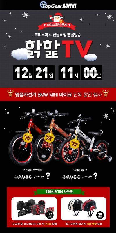 어린이자전거 BMW미니바이크를 판매하고 있는 유아토탈브랜드 팜앤모어는 오는 12월21일(월) 오전 11시 자사쇼핑몰 마파스토어(http://www.mapastore.co.kr/)를 통해 크리스마스 기념 '탑기어MINI' 앵콜방송을 진행한다고 밝혔다.
