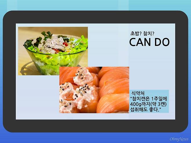둘 다 드셔도 됩니다. 일단 참치캔부터 살펴볼까요. 식품의약품안전처는 "일반 어류와 참치 통조림만을 섭취하는 경우에는 400g 이하가 적당하다"라는 권고안을 내놨습니다. 보통 참치캔 하나에 100g, 여기에 참치 살코기는 80g 정도 들어있습니다. 그러니 일주일에 400g이라는 건 3캔 이상 먹어도 된다는 거죠.