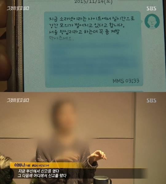 강간모의가 시작된 곳은 불법 음란사이트 ‘소라넷’ 이었다. 소라넷은 단순한 음란물이 올라오는 사이트가 아니었다. 인사불성 상태의 여자를 성폭행하기 위해 회원들을 초대하는 일명 ‘초대남’ 모집글이 하루에도 몇 건씩 올라오는가 하면 여성의 동의 없이 찍은 사진이나 영상이 게시되고, 여성의 얼굴과 신상정보를 고의적으로 드러내는 보복성 게시글인 ‘리벤지포르노’가 올라오는 곳이다. (사진=SBS)