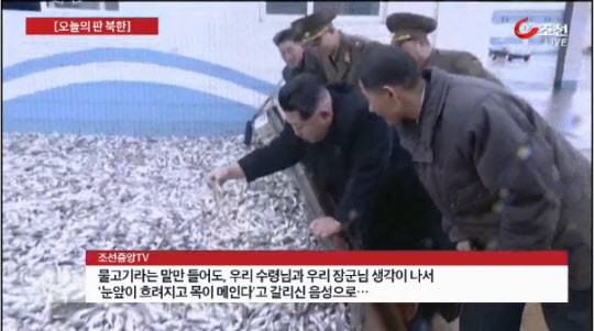 북한 관영 조선중앙TV가 김정은 노동당 제1비서의 유별난 ‘물고기 사랑’에 대해 보도했다. 김정은이 모범 수산 사업소에 쌓인 생선을 보며 얼린 동태 한 묶음을 높이 드는 장난을 치는 모습을 방송에 내보내기도 했다. 북한의 리포터는 “물고기라는 말만 들어도 우리 수령님과 우리 장군님 생각이 나서 눈앞이 흐려진다”고도 했다.