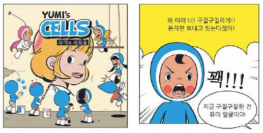 뇌 속 세포가 저마다 캐릭터를 갖고 있다면 어떨까. 시도 때도 없이 뭐가 먹고 싶은 건 ‘출출이 세포’ 탓, 때때로 센티멘탈해지는 건 ‘감성세포’ 때문, 뒤늦은 후회는 ‘뒷북세포’ 담당, 씻는 데 집착하지만 별로 힘은 없는 ‘세수세포’…. 온갖 세포들의 활약상을 다룬 만화 ‘유미의 세포들’은 연재 6개월도 안 돼 네이버 웹툰 인기 작품이 됐다.