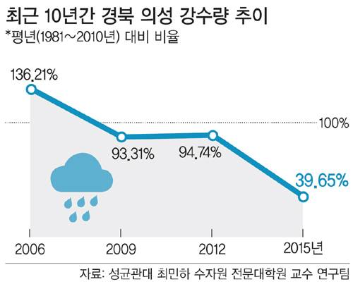 이 같은 강수량 부족은 의성에만 국한되는 것이 아니다. 기상청에 따르면 지난 한 해 우리나라 강수량은 평년(1303.0㎜) 대비 72%인 944.4㎜로, 1973년 기상 관측 이래 최소 3위를 기록했다.