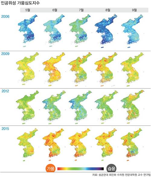 최민하 성균관대 수자원 전문대학원 교수(수자원학) 연구팀이 ‘인공위성 가뭄심도지수’를 토대로 작성한 ‘한반도 가뭄지도’에 따르면 2006년 5∼9월에는 전역이 습윤한 상태였다. 같은 해 7월 북한과 전라도 등 일부 지역을 제외하고 대체로 가뭄 피해가 없음을 의미하는 푸른빛을 띠었다.