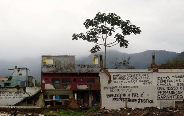 | 올림픽으로 강제철거 위기에 처한 리우데자네이루의 파벨라 비야 오토드로모의 모습. 마을에 남은 몇 안 되는 집 벽면에는 철거를 반대하는 문구가 적혀 있다. / ‘캐털리틱 커뮤니티’ 제공 |
