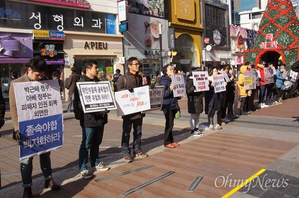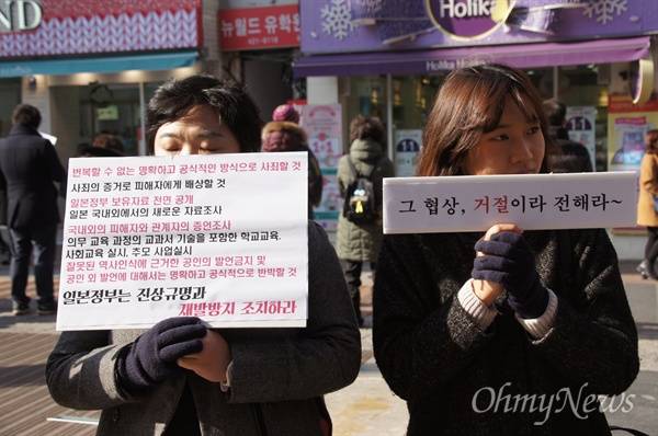 정신대할머니와함께하는 시민모임, 대구평화나비 등 대구지역 시민단체들과 대학생 등 50여 명은 6일 낮 12시부터 대구시 중구 동성로 대구백화점 앞에서 피켓을 들고 한일 위안부 협상의 무효를 선언하며 재협상을 요구했다.