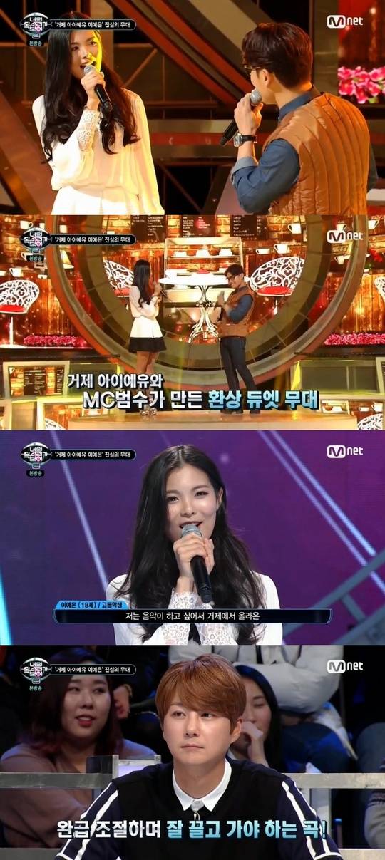이예은 씨는 "난 음악이 하고 싶어 거제에서 올라온 18살이다"고 자신을 소개했다. 김범수는 "제작진이 듀엣을 해달라고 해 음치인 것 같다고 생각해 기대도 안 하고 있었다. 깜짝 놀랐다"고 밝혔다.