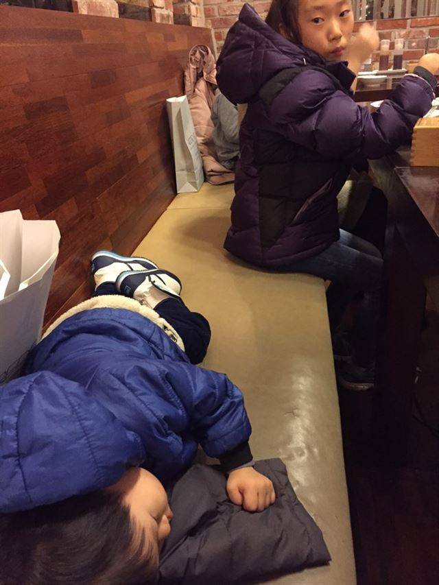 목욕탕을 다녀오면 이런 부작용도 있다. 즐겁게 놀면서 체력소모(탈수)가 컸던 나머지 너무 잘 잔다는 거다. 엄마 아빠의 저녁식사 약속 장소에서 대자로 뻗어 자는 아들. 다행히 뒤에 깨서 좀 먹긴 먹었다.