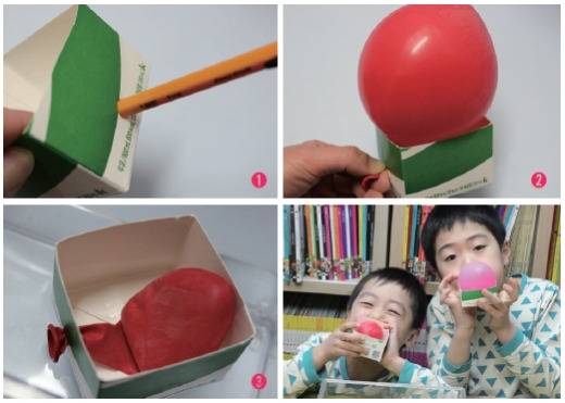 ① 200ml 우유곽을 씻어서 말린 후에 밑바닥을 기준으로 반으로 잘라주세요. 한쪽 면에 구멍을 내서 풍선을 끼워주세요.