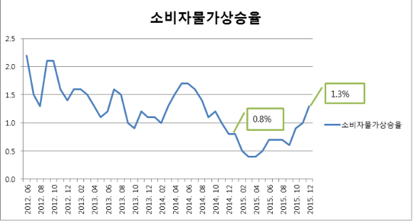 통계청이 매달 발표하는 소비자물가상승률은 지난해 같은 달과 비교한다. 이 때문에 당장 이달부터 담뱃값 인상 효과가 사라진다. 담뱃값은 지난해 1월 1일부터 올랐다. 담뱃값 인상은 지난해 1년 동안 매월 물가상승률을 0.58%포인트 높이는 ‘효자 노릇’을 톡톡히 했다. 지난 한 해 물가상승률이 0.7%였으니 담배 한 품목의 기여율이 82.5%나 됐던 셈이다. 담뱃값을 올리지 않았더라면 지난해 2~5월 물가상승률은 마이너스가 됐을 뻔했다. 그런 효자가 올해는 없다. 다만 전년동월비로 계산하면 ‘기저효과’도 생긴다. 지난해 물가가 워낙 가파르게 떨어졌기 때문에 지난해와 비교한 올해 물가상승률은 상대적으로 높아질 수 있다. 일종의 착시 효과다. 지난해 12월 소비자물가상승률이 갑자기 1.3%로 껑충 뛴 게 대표적이다. 2012년 11월부터 25개월 연속 1%대였던 물가상승률이 2014년 12월 0.8%로 뚝 떨어졌다. 그 덕에 2015년 12월 물가상승률은 그 이전보다 불쑥 솟아올랐다. 기저효과다. 이는 이달부터 위력을 발휘한다. 지난해 1~10월 물가상승률이 0%대로 기었던 만큼 올해는 약간만 물가가 올라도 상승률은 높아질 수 있다.