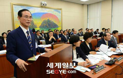 | 조남풍 재향군인회 회장이 지난해 10월18일 오후 서울 여의도 국회 정무위원회 보훈처 국정감사에 증인으로 참석해 의원들의 질문에 답변을 하고 있다. 남정탁 기자 |