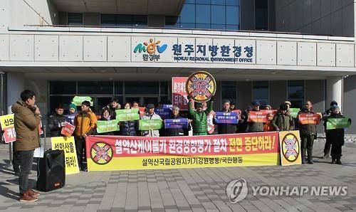 (원주=연합뉴스) 류일형 기자 = 설악산국립공원지키기강원행동과 설악산국립공원지키기국민행동, 케이블카반대설악권주민대책위 등 관계자 30여명은 12일 원주지방환경청 앞에서 기자회견을 하고 설악산케이블카사업 환경영향갈등조정협의회 즉각 재구성과 환경영향평가 초안 반려를 촉구했다.