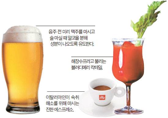 애주가들의 해장법은 따로 있다. 역삼동 ‘커피바케이’의 손석호 바텐더는 ‘블러디 메리’ 칵테일을 마신다. 토마토 주스에 우스터 소스(액상 조미료), 타바스코 소스(멕시코 붉은 고추 소스)를 섞고 보드카를 더해 만드는데 수프처럼 걸쭉하다. 청담동 ‘앨리스’의 김용주 대표는 모임 시작 두 시간 전 맥주를 마신다. 알코올 분해 성분이 음주 두 시간 뒤부터 분비되기 때문에 위에 미리 ‘신호탄’을 보내놓는 거다. 프렌치 레스토랑 ‘고메트리’의 김성모 셰프는 진한 에스프레소에 꿀 한 스푼을 넣어 마신다. 서교동에서 ‘몽로’를 운영하는 박찬일 셰프는 담백하고 시원한 평양냉면집에서 해장한다. 더플라자 호텔의 배병준 바텐더는 “체했을 때와 똑같이 손가락을 딴다”고 말했다. “십 년 넘게 고수하는 방법인데 심한 두통도 거짓말처럼 사라진다”고 했다.