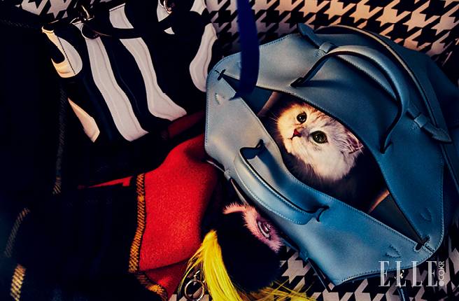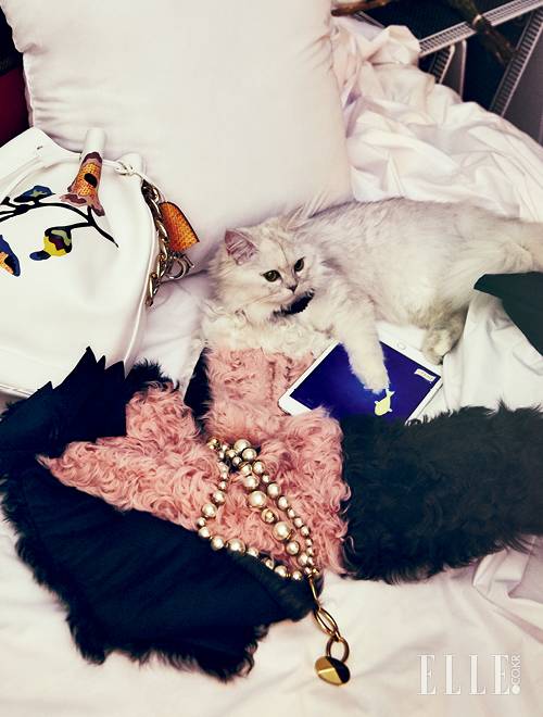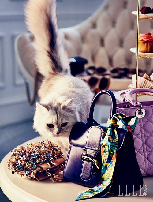 보태니컬 프린트의 화이트 버켓 백은 가격 미정, 골드 컬러의 볼 네크리스는 가격 미정, 모두 Dior. 컬러 배색의 퍼 머플러는 가격 미정, Raum. 고양이가 착용한 플라워 레이스 초커는 2만6천원, Dreaming Reverie. 실버 컬러의 아이패드 미니 4는 가격 미정, Apple.