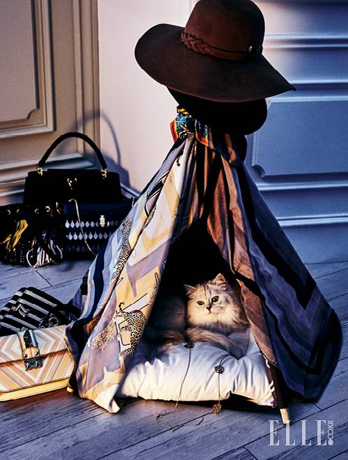 브라운과 블랙 컬러의 펠트 햇은 각 50만원대, 모두 Helen Kaminski. 텐트를 덮은 스퀘어 프린트 실크 스카프는 53만원, Paul Smith. 블랙과 파스텔컬러가 믹스된 실크 스카프는 가격 미정, Cartier. 매듭지은 엑조틱 프린트의 스키니 스카프는 16만8천원, Colombo. 로즈 네크리스는 1천1백만원대, Piaget. (앞쪽부터) 파스텔컬러의 록 백은 가격 미정, Valentino. 스트라이프 플랩 백은 5백만원대, Louis Vuitton. 멀티컬러의 엠마누엘 프린지 백은 2백70만원대, Saint Laurent by Hedi Slimane. 세르펜티 헤드 장식의 체인 백은 가격 미정, Bulgari. 블랙 컬러 카퓌신 백은 6백만원대, Louis Vuitton. 아늑한 티피 텐트와 쿠션 세트는 11만8천원, Huts & Bay.
