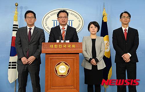 【서울=뉴시스】조수정 기자 = 최근 새누리당에 입당한 젊은전문가그룹 김태현(왼쪽부터) 변호사, 최진녕 전 대한변호사협회 대변인, 배승희 변호사, 변환봉 서울지방변호사회 사무총장이 14일 오전 서울 여의도 국회 정론관에서 기자회견을 열고 20대 총선 출마를 선언하고 있다. 2016.01.14.