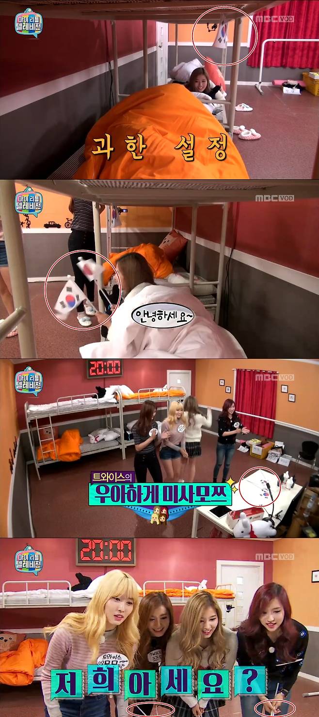 지난해 11월 22일 다음팟으로 생중계된 MBC '마이리틀텔레비전' MLT-16에는 트와이스의 미나, 사나, 모모, 쯔위가 출연했다. 방송 시작과 함께 약 2분 30초 동안 일본인인 미나, 모모, 사나와 대만인 쯔위는 각각 대한민국 국기와 자국 국기를 양 손에 들고 자기소개를 했다.