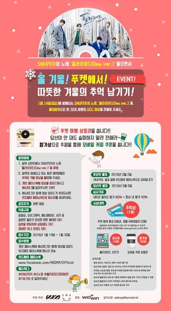 기간은 14일부터 30일까지다. 개인 페이스북에 # 스누퍼, # SNUPER, # 폴라로이드데이버전, # 1등 가자 등의 해시태그를 달아 영상을 업로드하고, '위드메이' 페이스북에 메시지를 전송하면 된다.