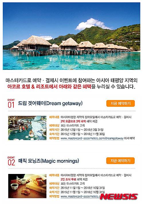 두 행사 모두 아코르 호텔의 로열티 프로그램인 '르 클럽 아코르호텔'에 가입한 만 21세 이상 마스터카드 고객만이 대상이며 예약은 프로모션 웹사이트(mastercard-accorhotels.com)에서 하면 된다.