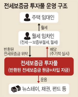 14일 금융위 설명에 따르면 전세보증금 투자풀은 한국증권금융 등이 월세 및 보증부 월세 전환으로 임차인이 집주인으로부터 돌려받은 돈을 위탁받아 투자풀(모펀드)을 조성하고 나서 다양한 성격의 하위 펀드에 자금을 나눠 분산 투자하는 ‘펀드 오브 펀드’ 방식으로 운영된다.