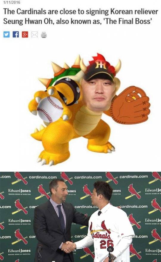 미국 메이저리그 세인트루이스 카디널스가 오승환(34)을 ‘끝판왕’이라고 지칭하며 슈퍼마리오의 악당 보스 ‘쿠파’와 합성한 이미지를 올렸다.