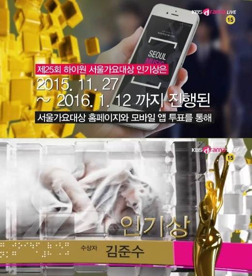이날 주요시상과 축하무대로 꾸며진 1부가 마무리된 후 영상에는 김준수의 인기상 수상 소식이 전해졌다.