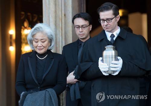 epa05101421 Tomoko Sakurai-Masur (L), the widow of German conductor Kurt Masur, and their son Ken-David Masur (C), accompany the urn after funeral services at St. Thomas Church in Leipzig, Germany, 14 January 2016. Masur died at the age of 88 in Greenwich, Conneticut, USA on 19 December 2015. EPA/HENDRIK쟔CHMIDT