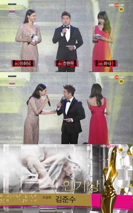 하니는 “있다. 오늘 인기상을 수상한다. 비록 무대에는 서지 않지만, 자랑스럽다. 그분”이라고 김준수의 수상을 직접 축하했다. 전현무의 “준수하니”에 표정이 굳었던 하니는 김준수의 인기상 수상에서는 확연히 달라졌다. 밝은 미소까지 볼 수 있었다.