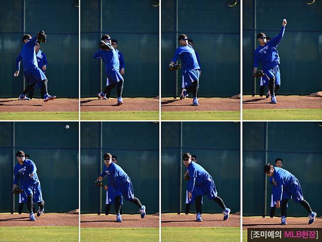 < 지난해 5월 어깨 수술을 한 류현진이 캐멀백 랜치에서 불펜 마운드에 올라 피칭을 하고 있다. 수술 이후 처음으로 마운드에 오른 것이다. >