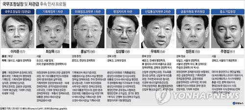 (서울=연합뉴스) 장예진 기자 = 박 대통령은 지난 13일 기획재정부 등 5개 부처 신임 장관을 임명한 데 이어 후속 인사로 국무조정실장과 6개 부처 차관급 인사를 단행했다고 청와대가 밝혔다.