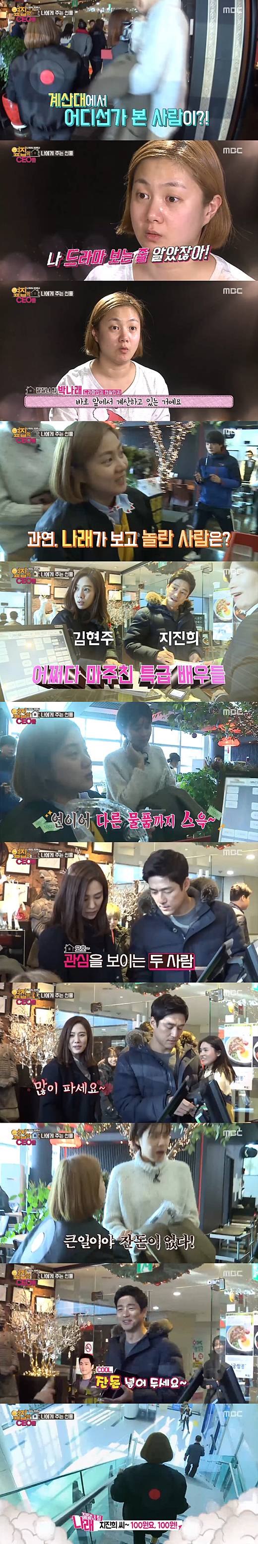 박나래는 "대박! 나 드라마 보는 줄 알았다. 계산하려고 서있는데 바로 앞에서 계산하고 있더라"고 했다. 박나래는 이 틈을 놓치지 않고 두 사람에게 자신이 팔고 있던 물건을 내밀었고, 지진희가 관심을 보이며 구매를 결정했다. 특히 박나래는 잔돈이 모자라 100원을 거슬러 주지 못해 지진희가 웃으며 자리를 떴는데, 박나래는 "이러면 안 된다"며 황급히 100원을 구해 지진희에게 달려가 웃음을 줬다.