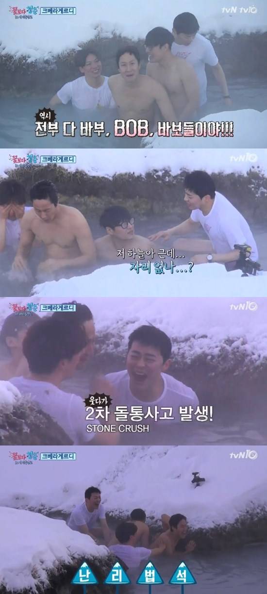 이날 한참을 걸은 조정석, 정상훈, 정우, 강하늘은 온천을 발견하고 뛰어들었다.