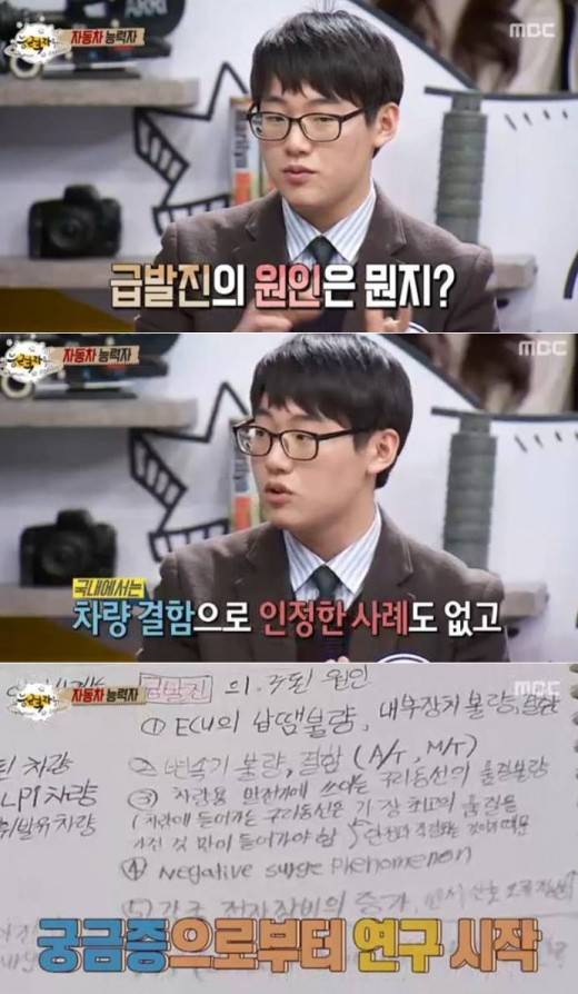 이날 고교생 세 명으로 구성된 자동차 덕후들이 출연했다. 이 중 한 학생은 급발진의 원인이 무엇인지 궁금해 자동차 연구를 시작했다며 연구 노트를 내밀어 놀라움을 자아냈다.