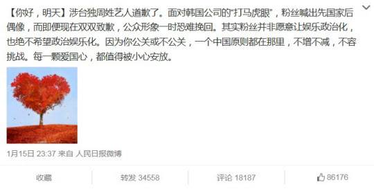 인민일보 또한 웨이보를 통해 “팬들은 사실 예능이 정치화가 되거나 정치가 예능화되는 것을 원한 것이 아니다”라며 “공적이든 사적이든 ‘하나의 중국’이라는 원칙은 변하지 않고, 도전을 용납하지 않는 것”이라고 했다. 인민일보는 또한 “쯔위의 사과에도 불구, 이미지를 만회하는 것은 당분간 어려울 것”이라는 평가를 내렸다.