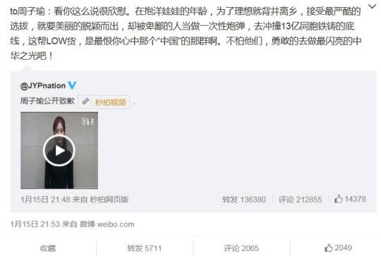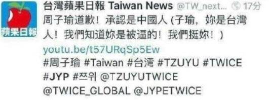 지난 15일 대만 출신인 쯔위는 공식 유튜브 채널에 올린 영상을 통해 중국어로 “중국은 하나밖에 없고, 저는 제가 중국인임을 언제나 자랑스럽게 여긴다”며 “사과 드리는 마음으로 중국 활동을 중단하고, 제 잘못을 돌아보도록 하겠다”고 사과했다.